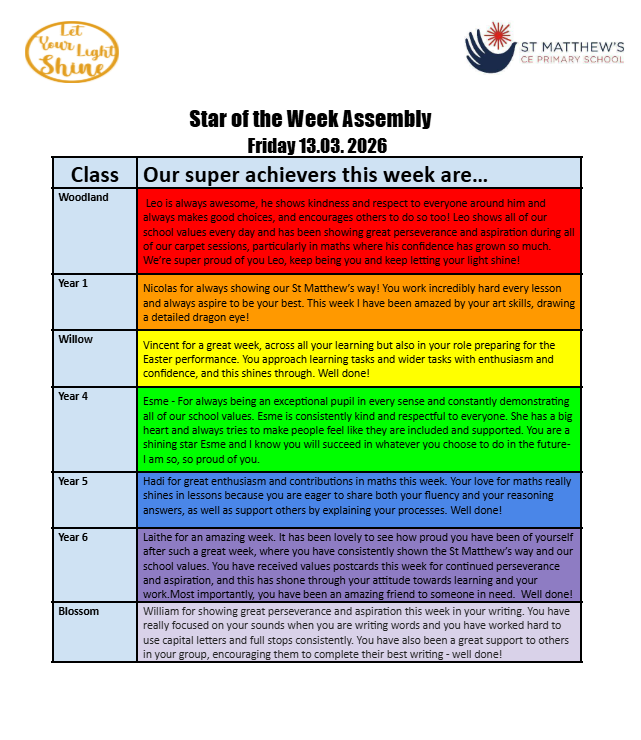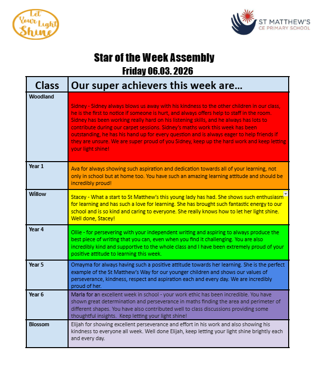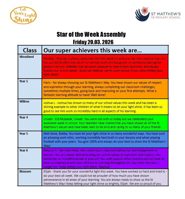 Please find our wonderful stars of the week attached to this post. I say this week after week, I do love our Friday Star of The Week Assemblies, getting the chance to listen to the teachers speak with such passion about how our children have shown our values or the St Matthew's Wayis just awesome! It's important that we take time to hear their growth and share how proud we are of them. A huge WELL DONE to each child who was celebrated today and let their light shine.